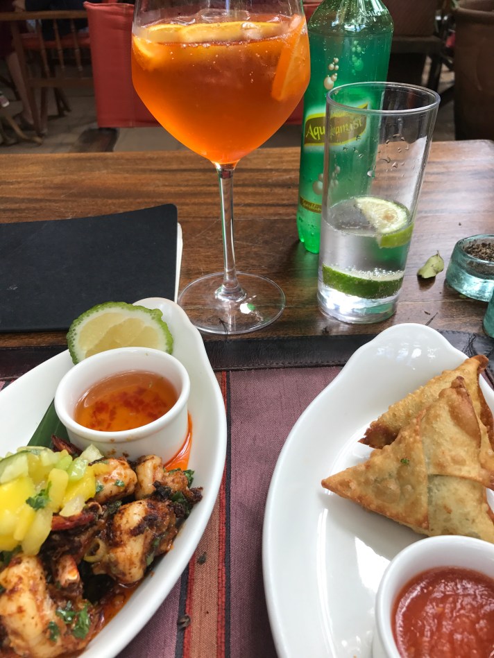 I had lunch at The Talisman. Thai prawns on the left with feta and cilantro samosas on the right. Plus an Aperol spritz. Ended with a rhubarb crumble and ice cream.