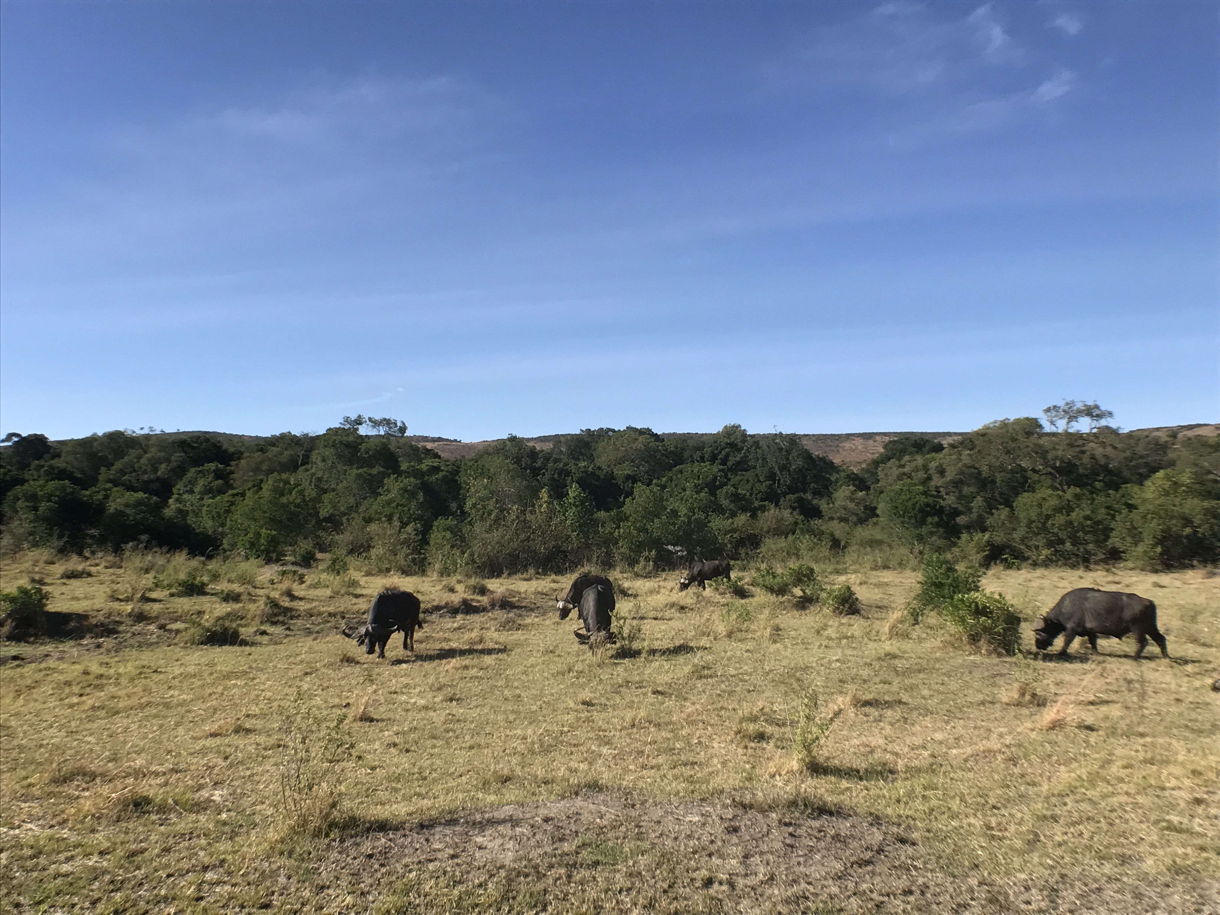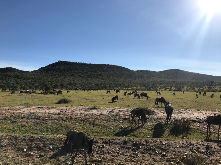 We arrived at the actual nature reserve around 8:30am. Maasai Mara – over 550 square miles of land bordering the Serengeti in Tanzania. Within minutes of entering wildebeests surrounded our van. Further down we saw buffalo. These were real wild animals.