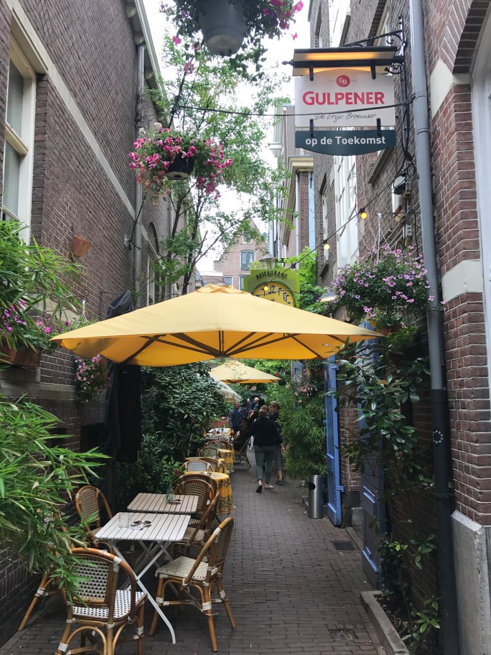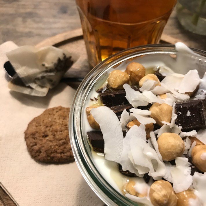 Sat down in Yoghurt Barn in the De Pijp neighborhood. Can’t wait for this trend in the U.S. Choose a size, yogurt base and toppings. I chose a house specialty – Choco Caramba. Dark chocolate chunks, banana, coconut flakes and hazelnuts! So good. Heel goed! Also had some hot tea to warm up from the monsoon outside.