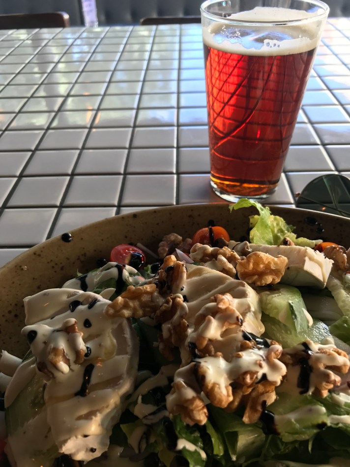 Somehow I found Hops. The patio was slammed so it looked like a good choice for super late lunch/too-early dinner. I’ve already forgotten the beer but I’ll never forget the chèvre salad. It had four massive pieces of cheese, tomato, cucumber. All the good stuff piled high with balsamic dressing. So so good.
