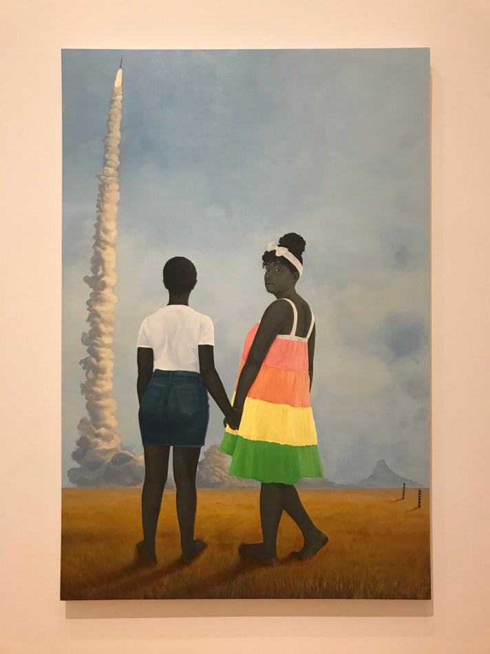 This is Planes, rockets, and the spaces in between by Amy Sherald. It’s currently on display at the Baltimore Museum of Art. I like the color palette and the shadows. The tufts of smoke stacked beneath the rocket. Barefoot spectators.